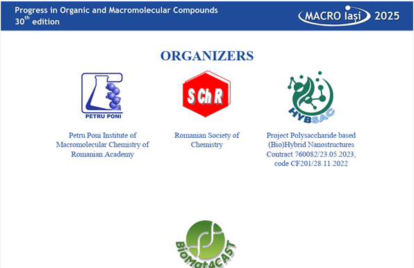 The BioMat4CAST project team has been part of team for the 30th edition of the International Conference Progress in Organic and Macromolecular Compounds (MACRO Iași 2025) held between 23–26 September 2025 in Iași, organized by the “Petru Poni” Institute of Macromolecular Chemistry. This traditional scientific event is dedicated to polymer and organic chemists and physicists from academia, research institutes, and industry, serving as a dynamic platform for the dissemination of research results, exchange of ideas, and promotion of interdisciplinary collaborations.
