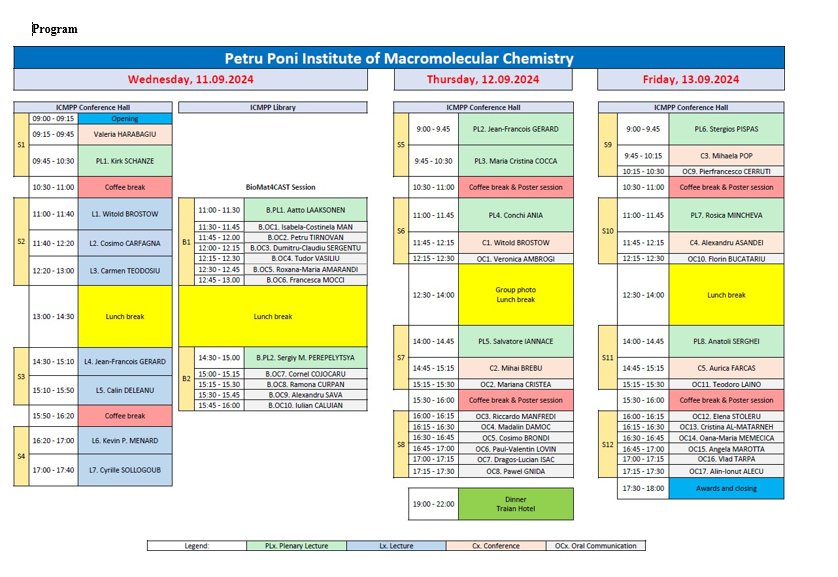 The conference featured numerous distinguished invited speakers, who shared their expertise through lectures on highly specialized topics. Alexander Bismarck (Vienna University, Austria) presented Turning liquids solid: From emulsions to micromixers, while Rénato Froidevaux (University of Lille, France) discussed Hybrid catalysis: A powerful synergy between chemical and biological catalysis. Aatto Laaksonen (the BioMat4CAST ERA Chair ICMPP, Iași, Romania, Stockholm University, Sweden;) gave a lecture on In silico studies of nature’s hierarchical creation, and Anne Ladegaard Skov (DTU, Copenhagen, Denmark) presented Artificial muscles from bundles of silicone-based dielectric elastomer fibers. Piotr Rychter (Jan Dlugosz University, Poland) addressed Environmental aspects of polymers and polymer wastes, Olya Stoilova (IP-BAS, Sofia, Bulgaria) spoke on Advanced electrospun materials: From design to prospective applications, and Daniel B. Werz (Albert-Ludwigs-Universität Freiburg, Germany) shared insights on Fluorescent dyes by rational design and serendipitous discoveries.